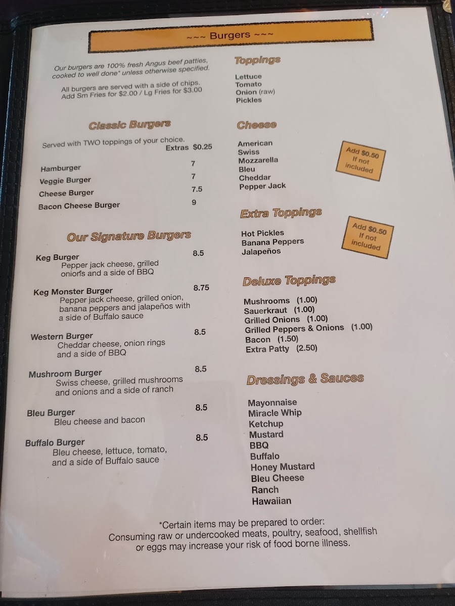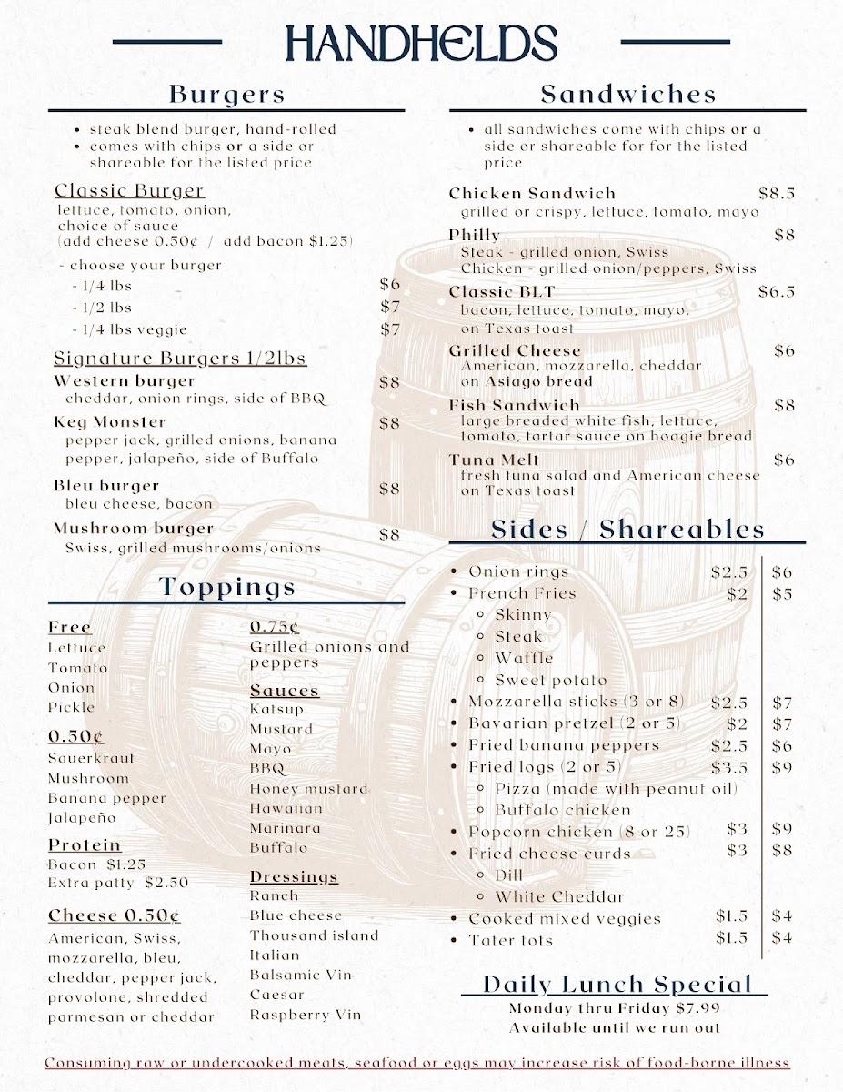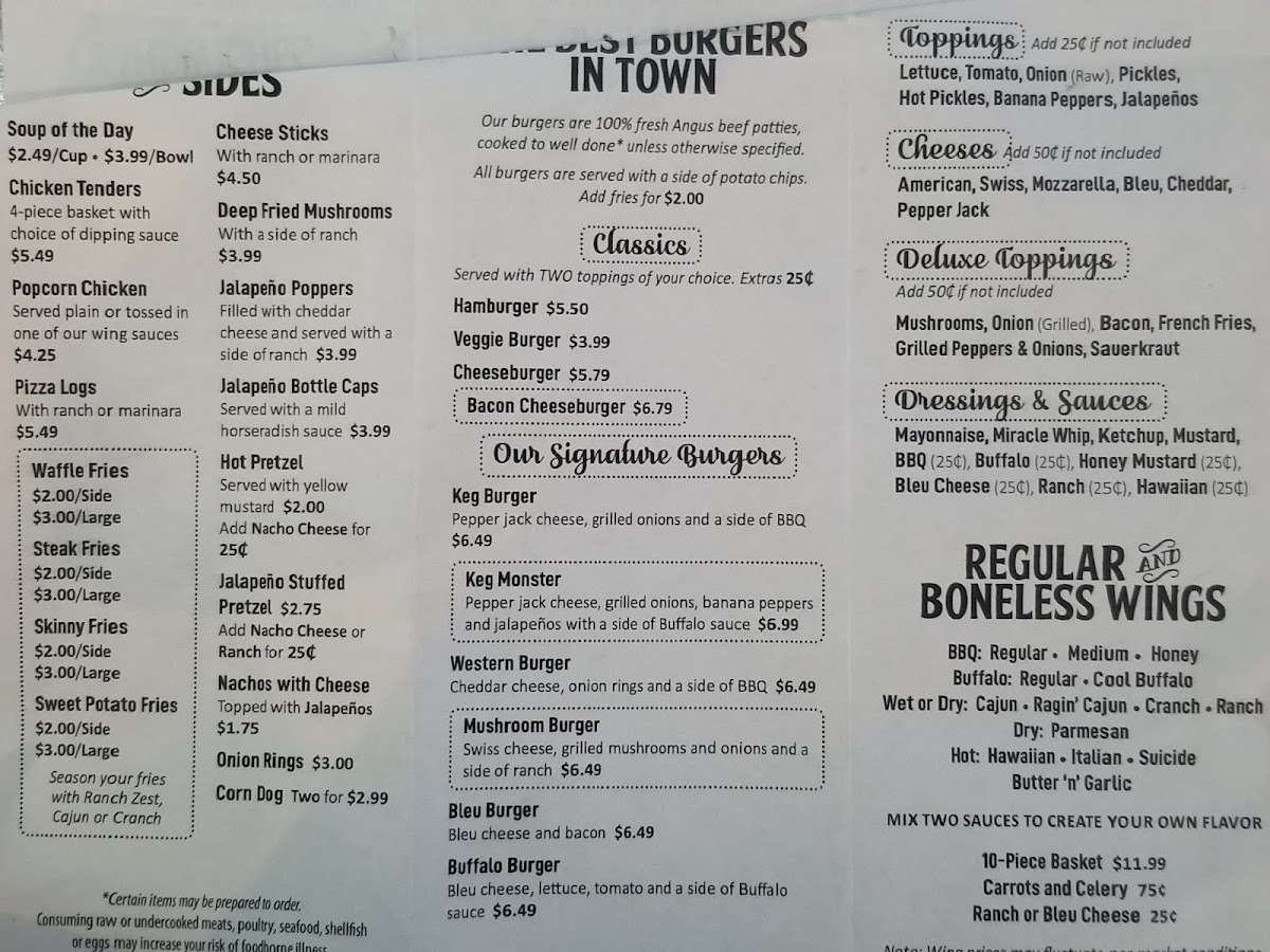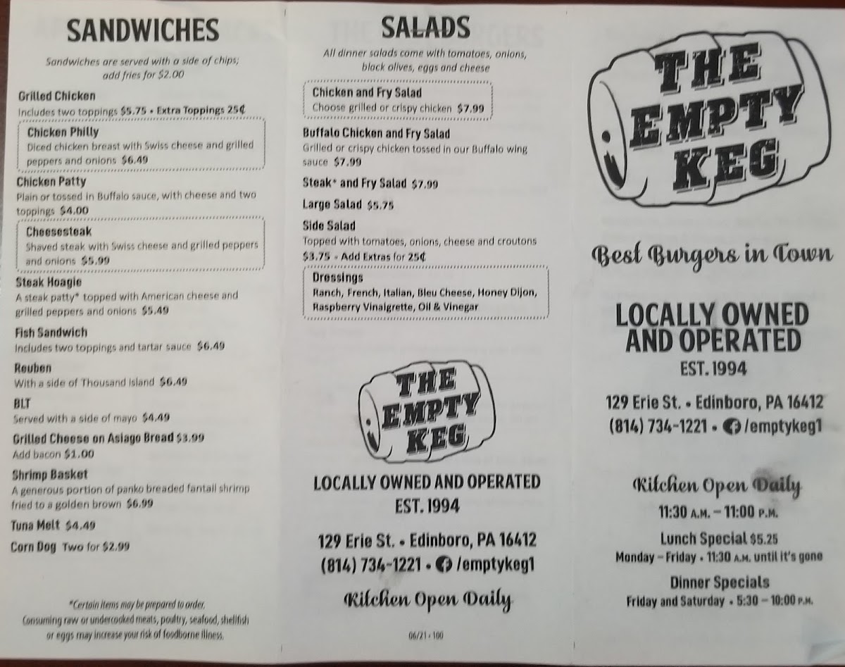 If you’re in the mood for a laid-back, friendly spot to grab a bite, Empty Keg Menu offers a great variety of mouth-watering options. Located at 129 Erie St in Edinboro, PA, it’s a favorite among locals and visitors alike. You’ll find everything from savory appetizers to hearty main courses, perfect for satisfying any craving. Whether you're stopping by for a casual meal with friends or a cozy dinner, there’s something for everyone here. The menu features a mix of traditional favorites and unique dishes that are sure to keep you coming back for more. Whether you're in the mood for a refreshing drink or a delicious plate, you'll be pleased with what Empty Keg has to offer.